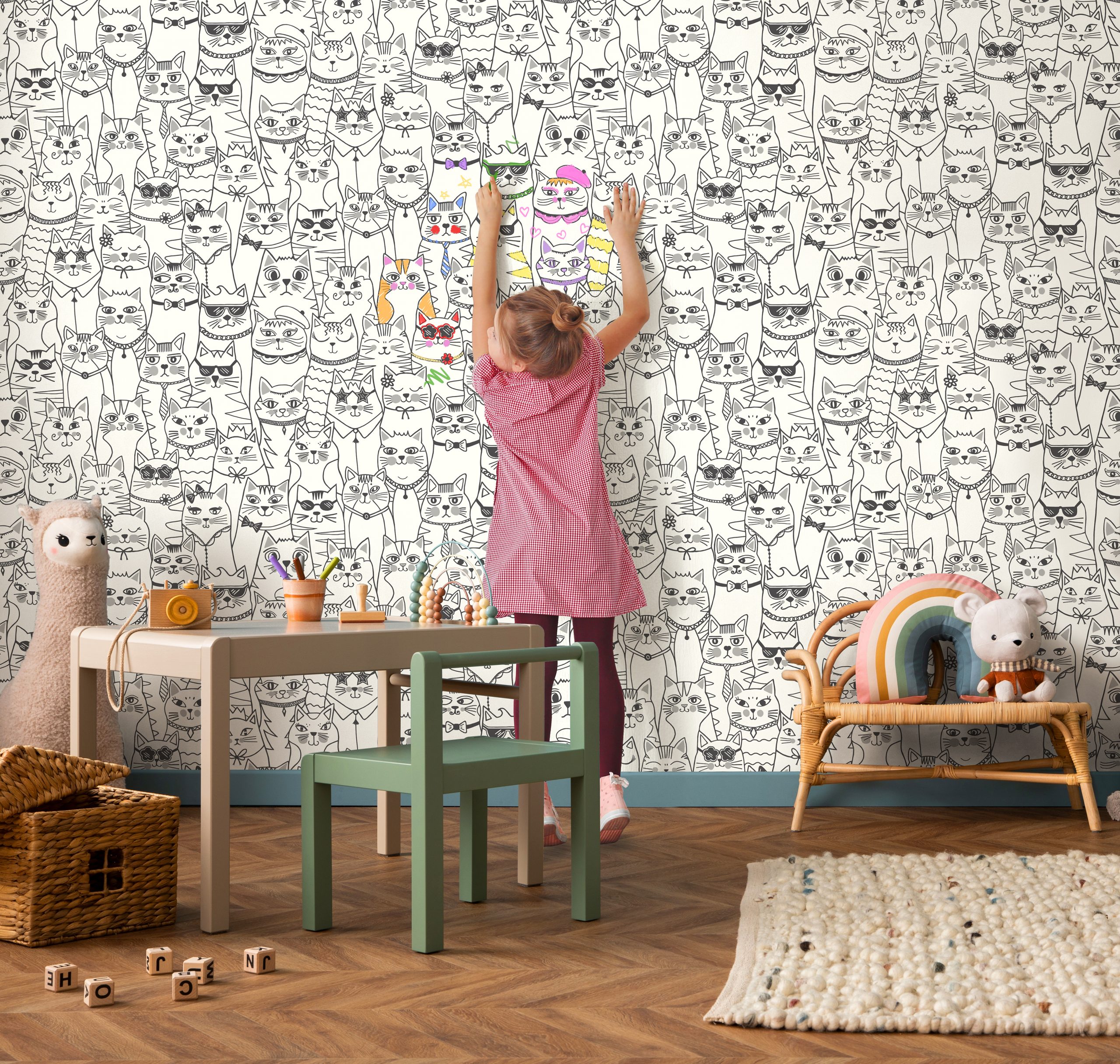 En målarbildstapet med en samling lekfulla katter som förvandlar ditt rum till en kreativ lekplats.