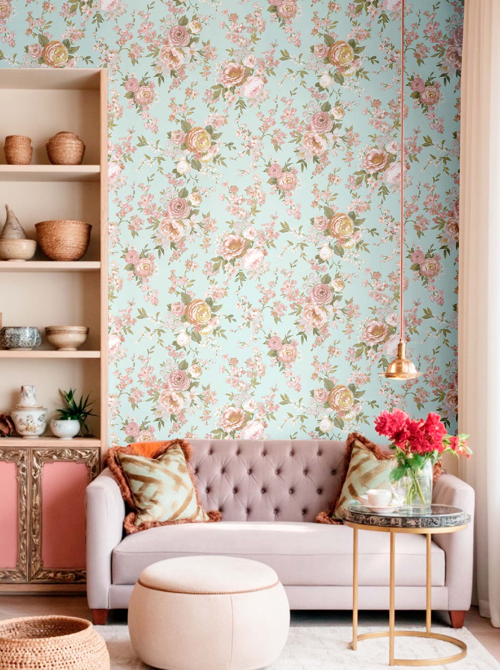 Primula har ett blommigt mönster där de små blommorna tillsammans skapar ett rutigt uttryck som på avstånd även upplevs som ett diskret prickmönster över väggen. Det dekorativa uttrycket ger rummet en levande men balanserad känsla som passar den stil som efterfrågas.