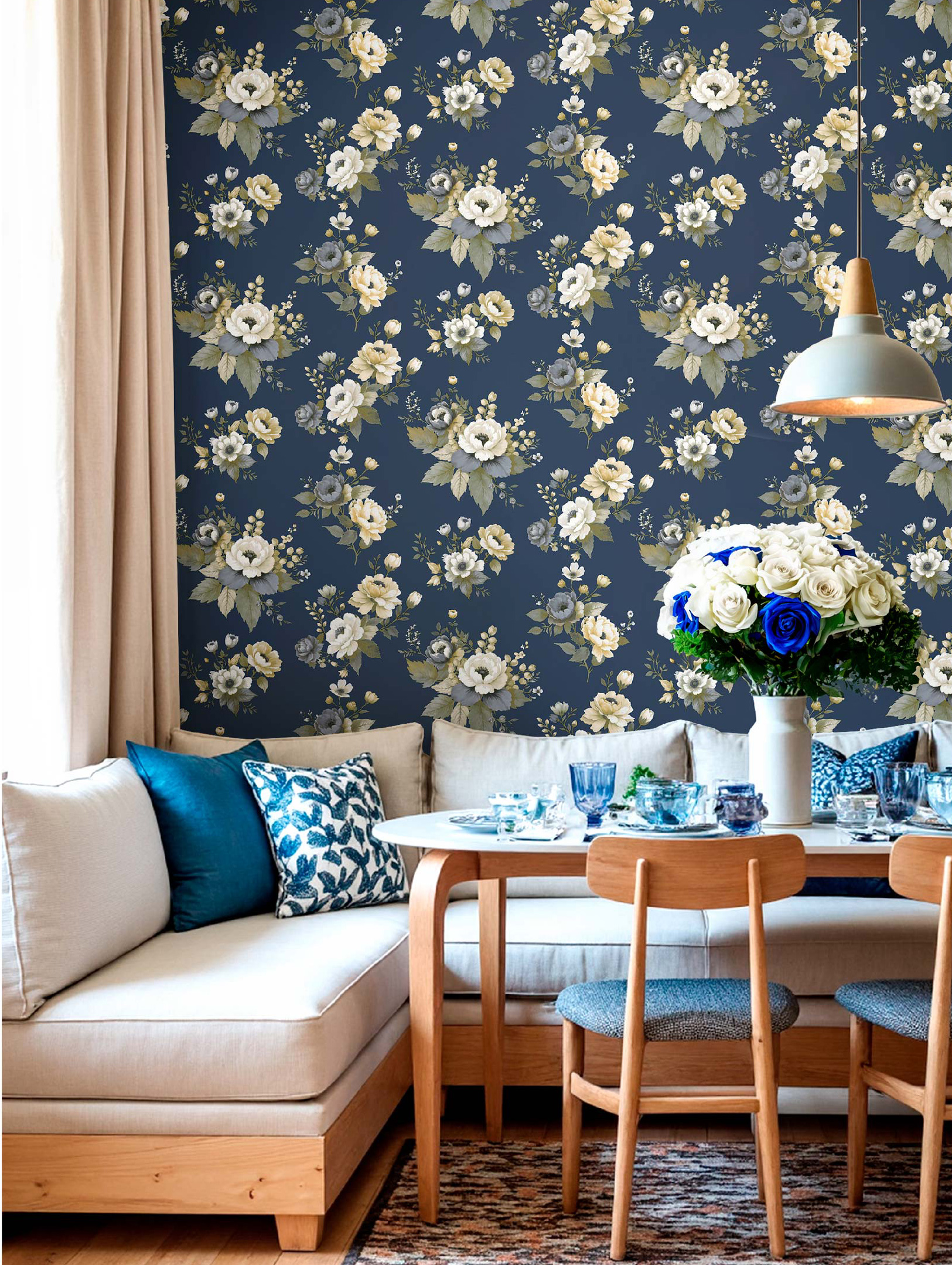 Primula har ett blommigt mönster där de små blommorna tillsammans skapar ett rutigt uttryck som på avstånd även upplevs som ett diskret prickmönster över väggen. Det dekorativa uttrycket ger rummet en levande men balanserad känsla som passar den stil som efterfrågas.