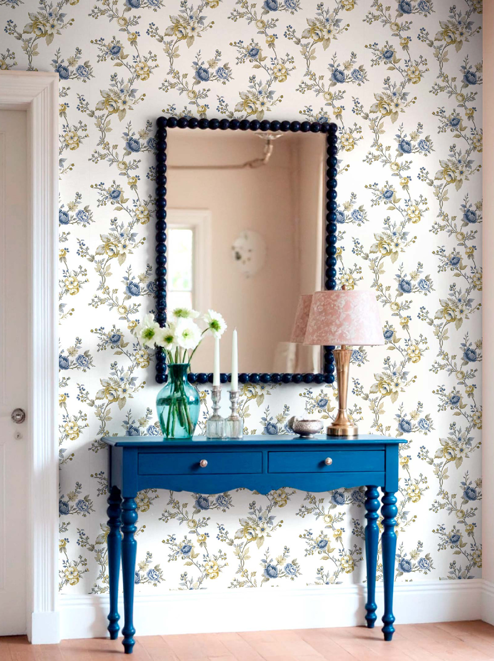 Tapeten Dafne har ett klassiskt blommönster där blad och blommande grenar samspelar i ett mjukt och balanserat uttryck. Den diskreta strukturen i ytan ger en känsla av vävt tyg och tillför både djup och liv till väggen.