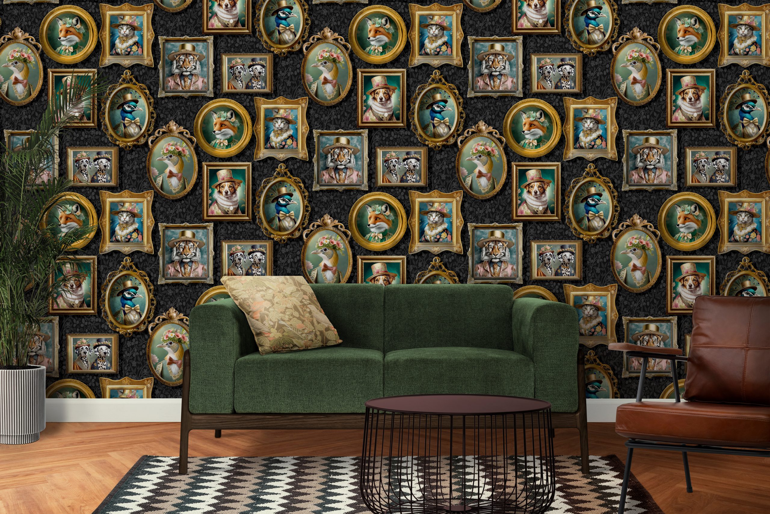 Eleganta tavelramar som visar charmiga djur i utsökta viktorianska kläder. Från stiliga hundar i höghattar till graciösa rävar i aftonkläder. Varje porträtt har en lekfull fantasi och allt detta mot en mjuk lövslinga i bakgrunden.