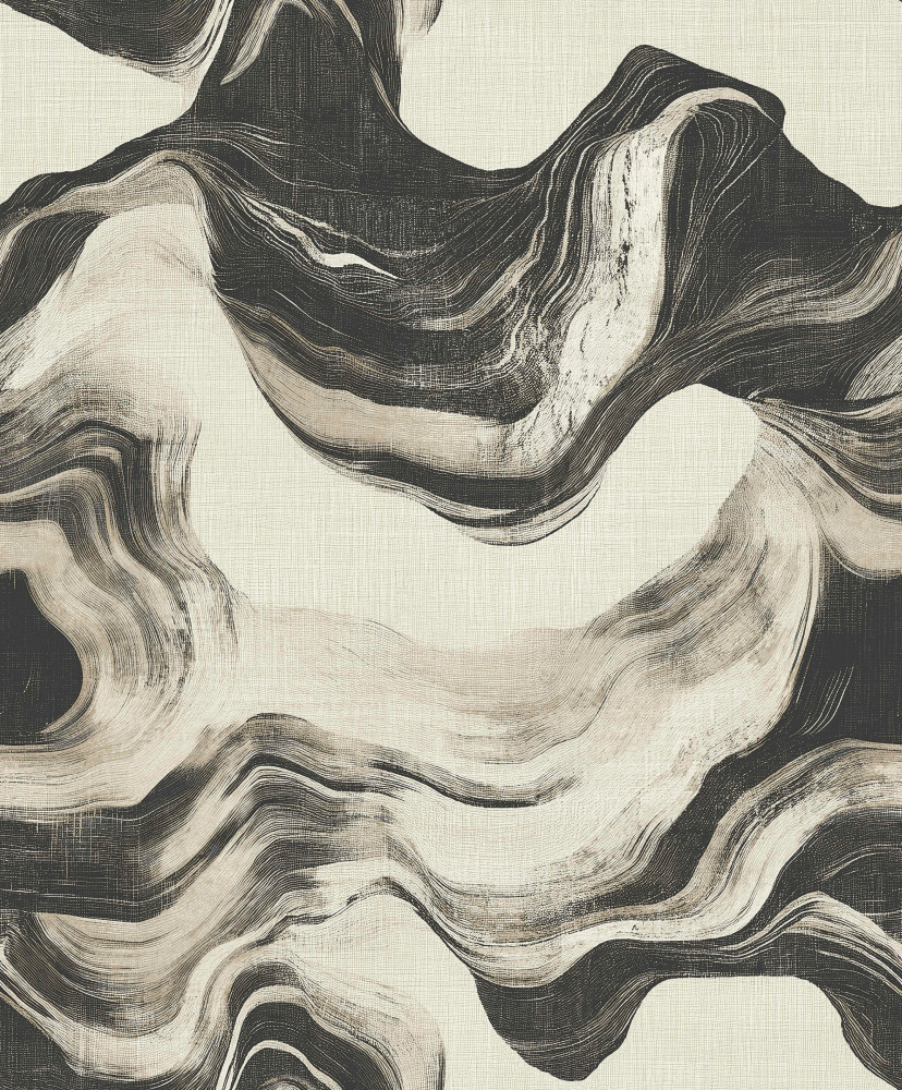 Ett konstnärligt mönster inspirerat av formad sten har här tolkats i ett samtida uttryck där de svepande, lager på lager-liknande formerna för tankarna till naturligt skulpterade bergssnitt. Kontrasten mellan ljusa och mörka partier skapar ett dramatiskt djup som ger väggen både energi och elegans, samtidigt som motivet balanserar naturens råa kraft med en grafisk precision.